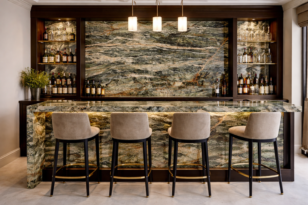Cuarcita Amazonico funciona en barras de cocina o baño, destacando como pieza central por su variación cromática.