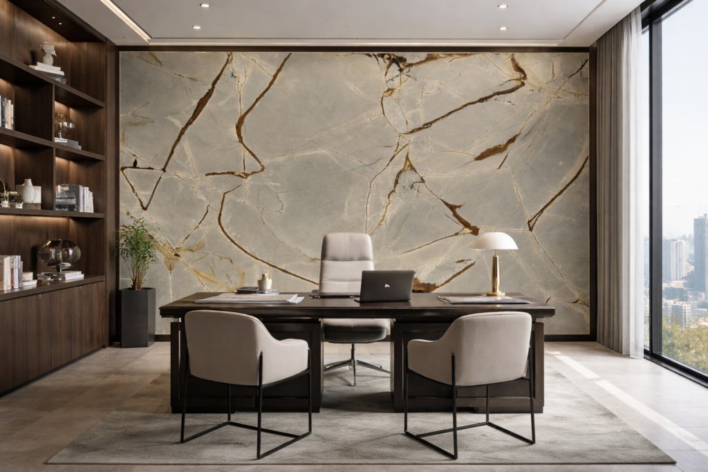 Cuarcita Blue Deep funciona especialmente bien en muros de acento, donde su gráfica natural actúa como elemento protagonista.