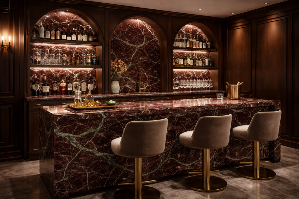 Cuarcita Carmine Red es una piedra natural de alta intensidad cromática, caracterizada por un fondo rojo profundo con una red de vetas en tonos verdes y claros. Su contraste extremo y patrón orgánico la convierten en una pieza protagonista para proyectos de alto impacto visual.