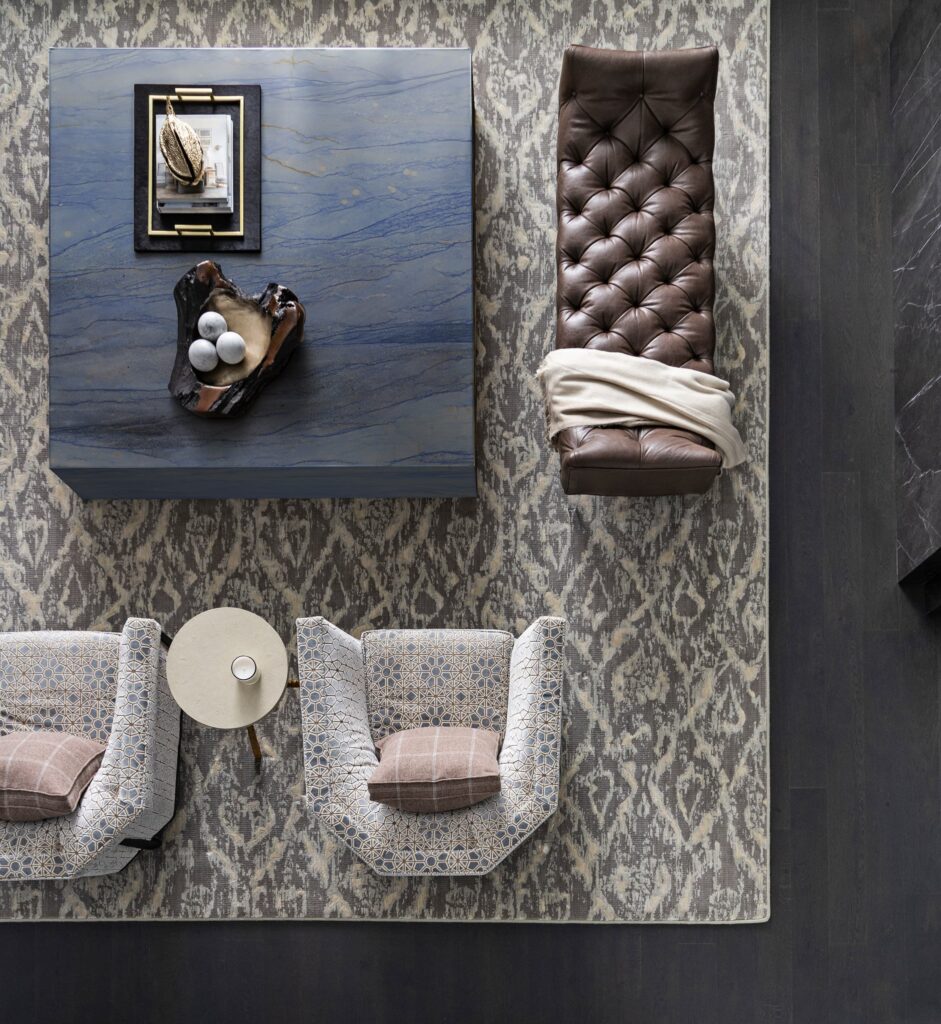 Cuarcita Blue Paradise puede emplearse en cubiertas de comedor o mobiliario decorativo, integrando color y textura en el diseño.
