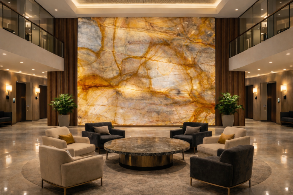 Cuarcita Louise Blue es una piedra natural de alta expresividad visual, caracterizada por una base clara con vetas intensas en tonos dorados, miel y ámbar. Su composición y apariencia semitranslúcida la posicionan como un material de acento para proyectos de alto nivel estético.