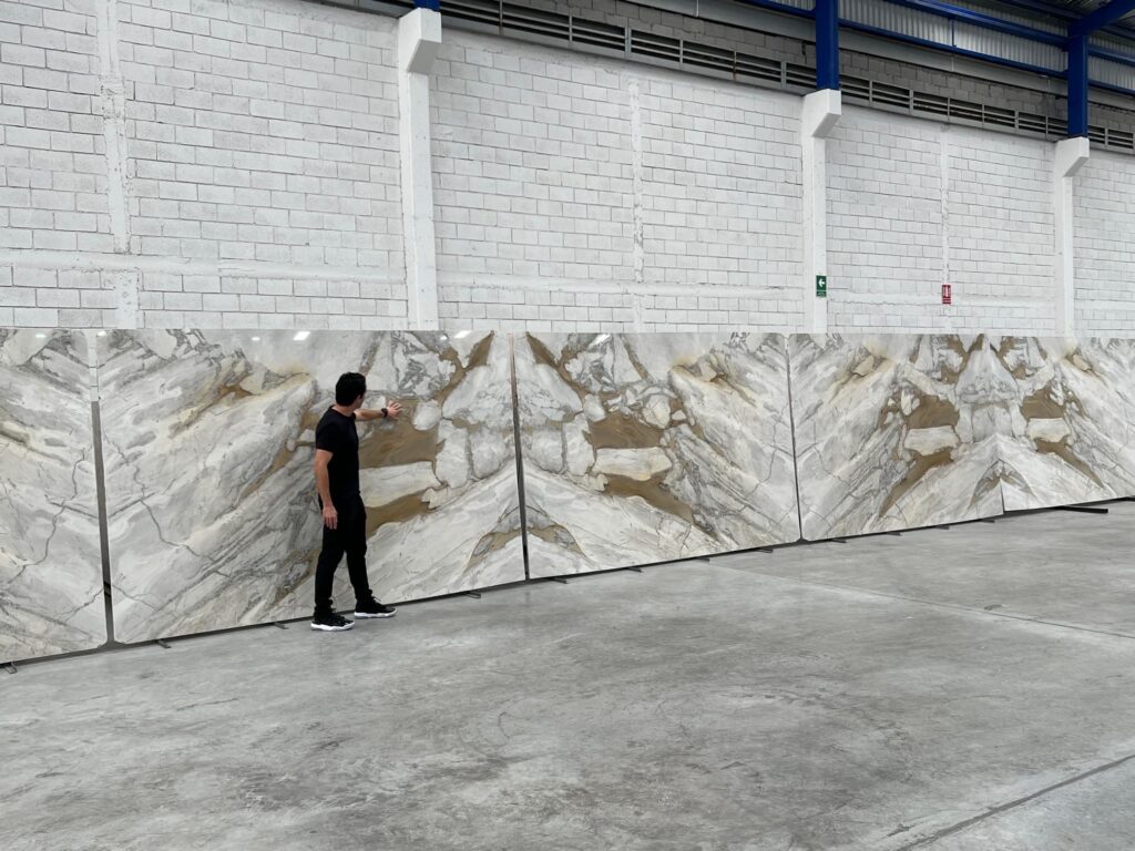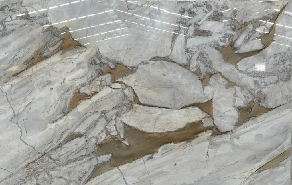 - Color: El Calacatta Gold Caramella se caracteriza por su fondo blanco brillante con vetas doradas y grises que se entrelazan, formando un patrón único y elegante.